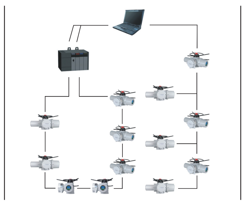 图:采用了现场总线方式连接执行机构的情况。为满足不同现场控制系统的需要,IQ系列智能电动执行机构为用户提供了不同标准的现场总线控制模块。